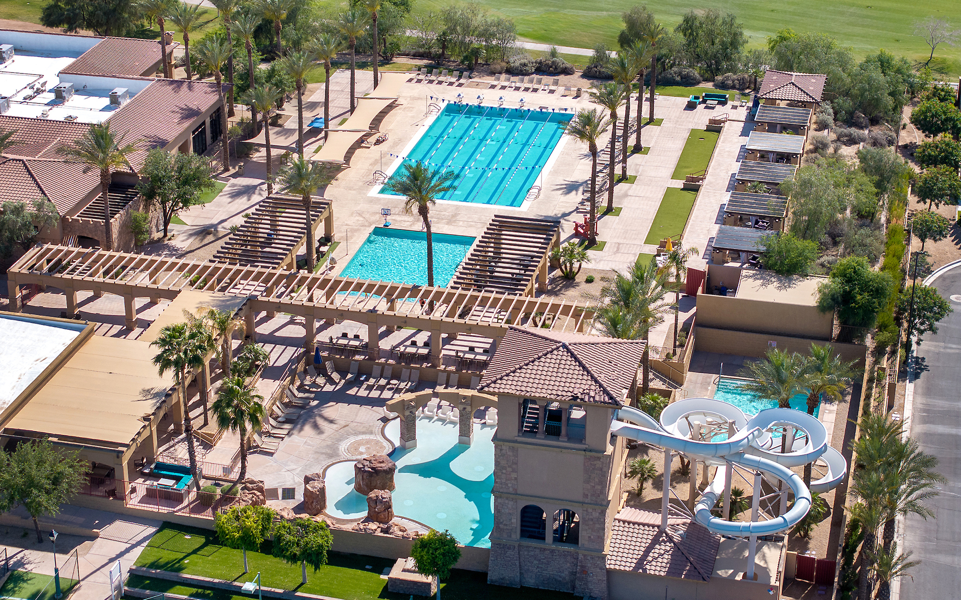 Seville’s Water Park near Phoenix features more than 250,000 gallons of water for your splashing pleasure. With four pools: Terrace, negative edge lap pool, waterslides and Lagoon Pool, we have something for everyone.